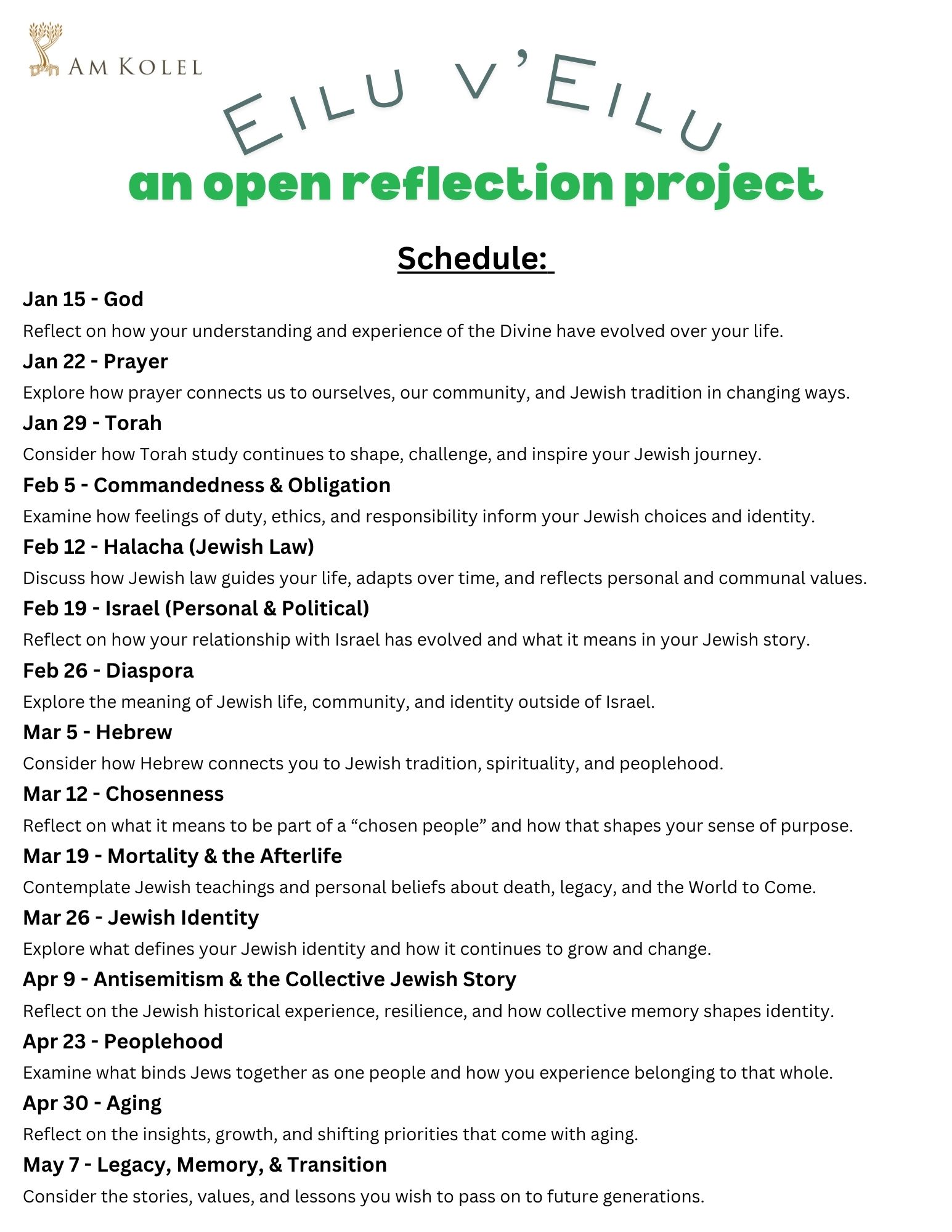 This series offers a gentle space to pause and explore questions that have shaped your Jewish life. Together, we’ll reflect and share, not to find “right answers,” but to uncover meaning through our own experiences and stories.